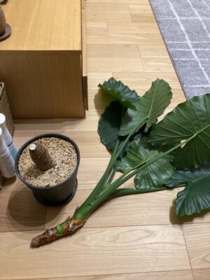 地元のお花屋さんにで安売りしていて購入したクワズイモ。