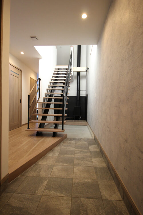 玄関ドアを開けると真っ直ぐ続く土間の奥に薪ストーブがあります。
