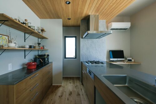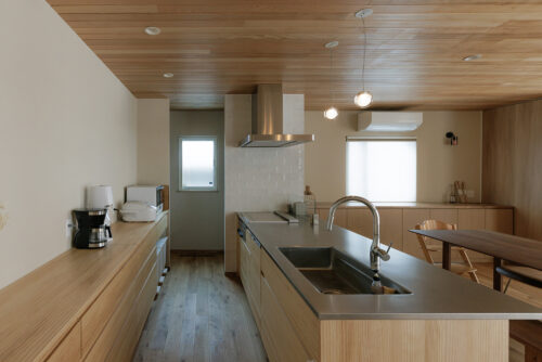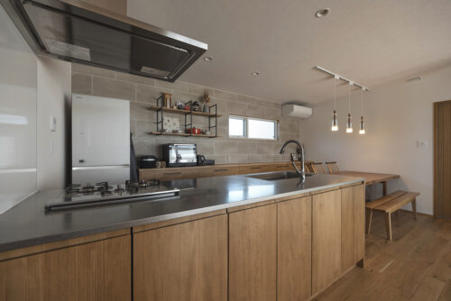 パインやナラといった無垢材の扉が特徴のキッチンです。