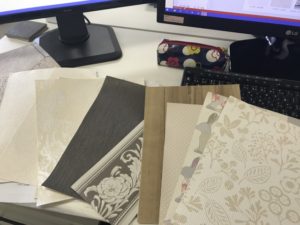クロスのサンプルが散乱してます(汗) サンプルを取ってみてみると意外とイメージと違ったりするので サンプルの確認は大事ですね。