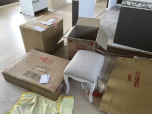 段ボールいっぱい。 テーブルなどの簡単に組み立てられるものを組立て、 家具・雑貨などに傷がないか検品します。 設置は、まだ少し工事が残っているので終わってから行います。