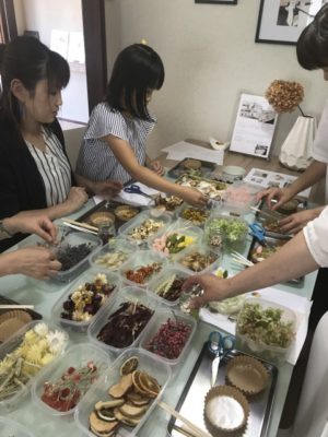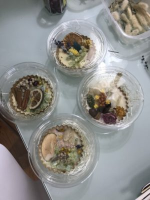 ワークショップ前、テーブルにはたくさんのドライフラワーやドライフルーツ、