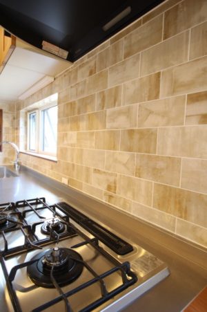 色違いでキッチンと、後ろのカップボードの壁に張ったタイルです。