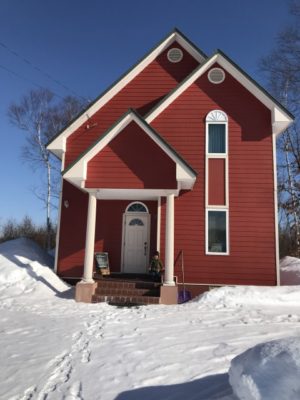 真っ白な雪の中にポツンと佇む赤茶色の外壁のお家。