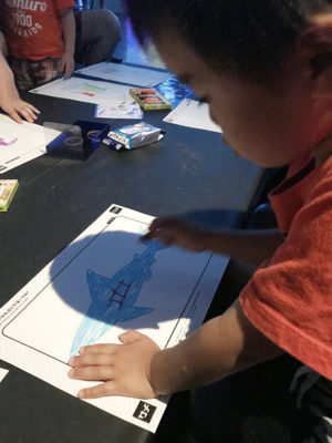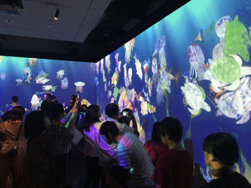 自分で色を塗った海の生き物が、巨大スクリーンの中を泳ぎます。