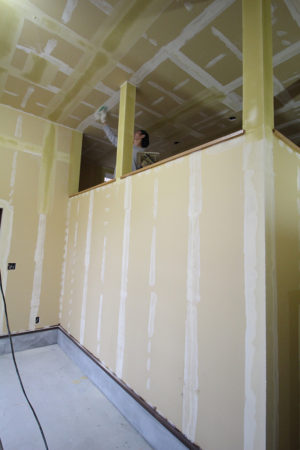 石膏ボードの継ぎ目やビス部分のパテ処理を行い、 乾いてから壁紙を貼っていきます。 来週いっぱいで内装工事も終わり仕上げ工事を行っていきます。 完成までもう少し。