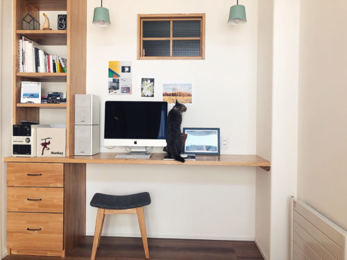 1階はパソコンを置いて造作してもらった棚に、