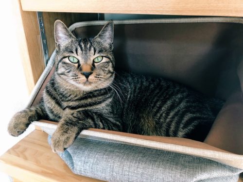 造作棚の下にカゴを置いたら、ハルが気に入ってお昼寝スペースになりました。