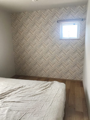 ヘリンボーン柄のナチュラルな壁紙。 周りのグレージュの無地壁紙とも相性バッチリで、 雰囲気も少し変わってお気に入りです。 ヘッドボードの位置も柄側に変更しました。 かわいい照明器具や雑貨を飾りたくなるそんな壁紙です。