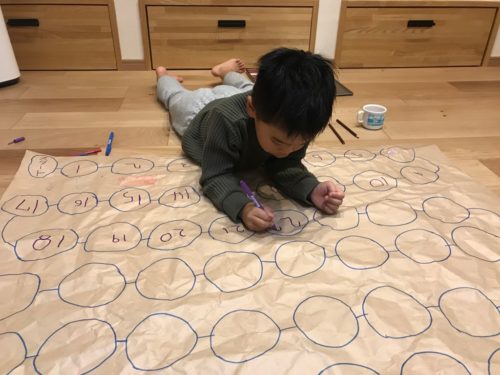 届いた荷物の梱包用の紙ですごろく作り。 なかなかこんなに大きくてきれいな紙ってないので息子も喜んでおりました。
