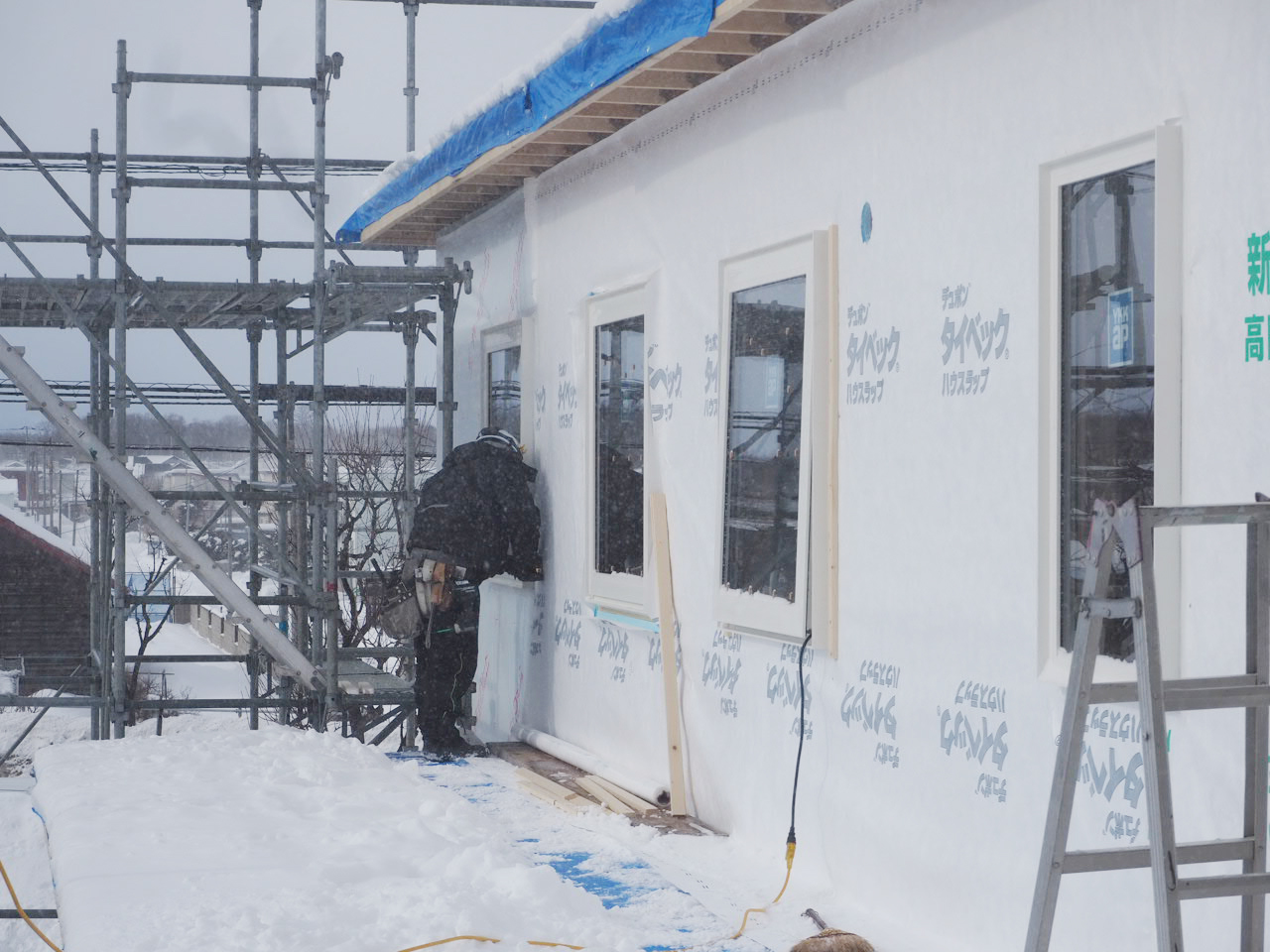 事務所横の増築もサッシが付き、外観の形がわかってきました。