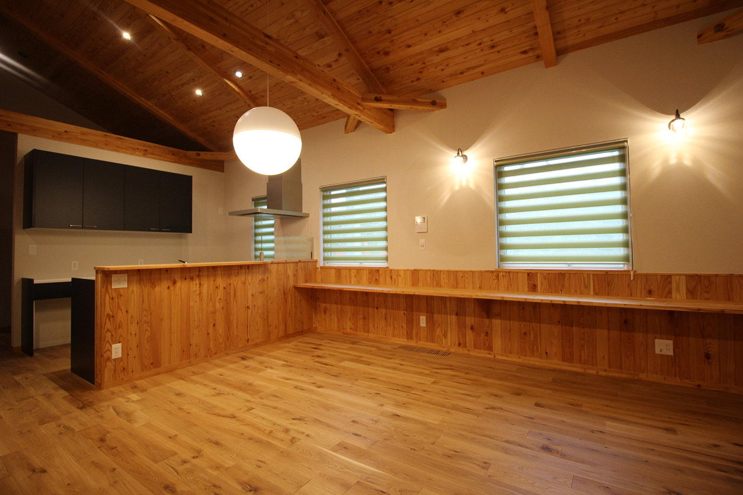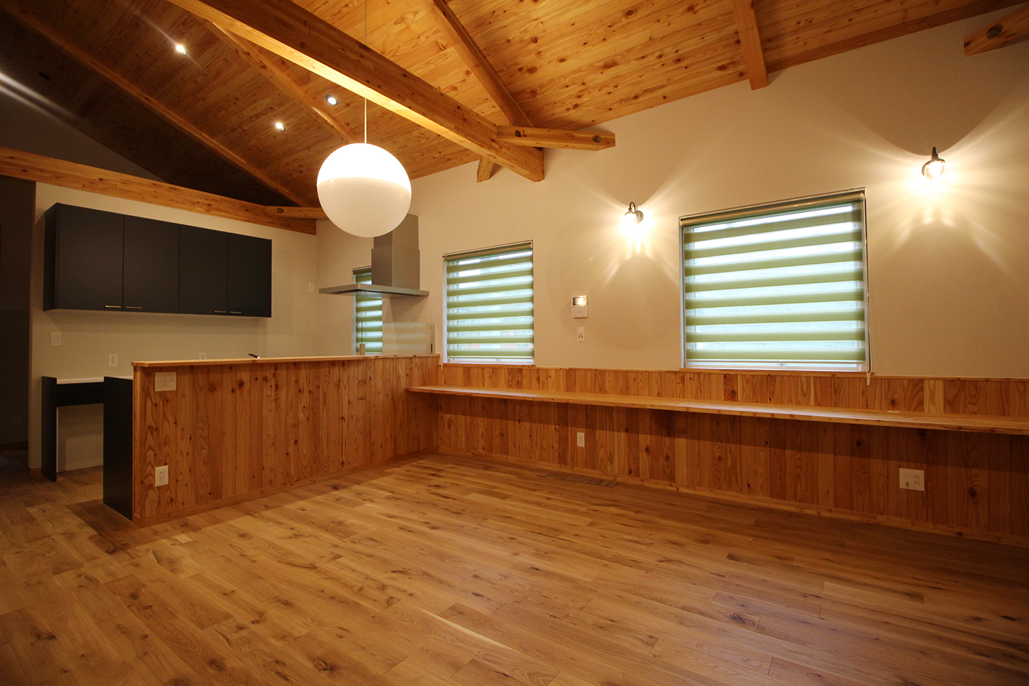 勾配天井の広々とした空間で、シンプルながらにも存在感のある器具を