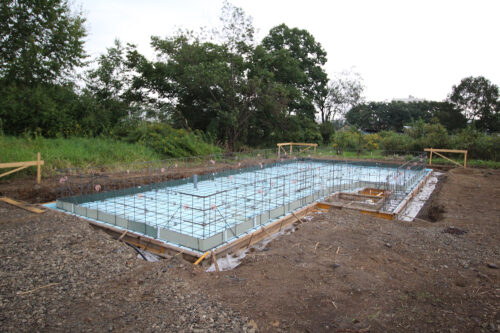 土間コンクリートを打って養生後、布基礎の組み立てを行います。