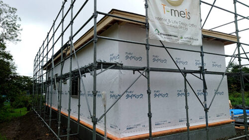塗り壁の外壁材の施工となりますのでタイベックシートを先貼りし、
