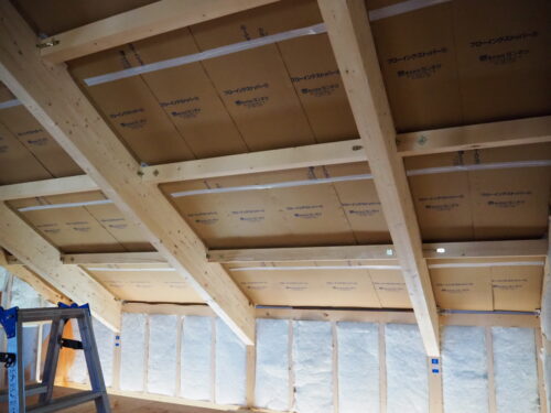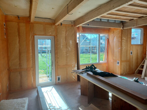 天井に見える黄色いものは1階と2階の間に入れたブローイングの断熱材です。