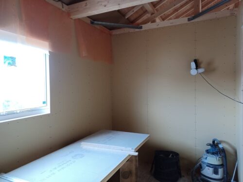 石膏ボードが貼られていくと部屋の大きさがよりはっきりとわかってきます。