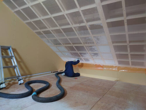 この後ネットを貼り、天井にブローイングの断熱材を吹き込んでいきます。