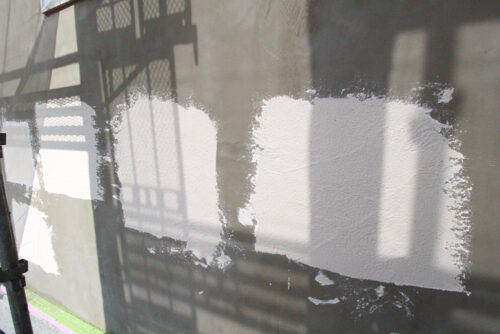 塗り壁のご住宅で、天気の様子を見ながら下塗りが行われました。
