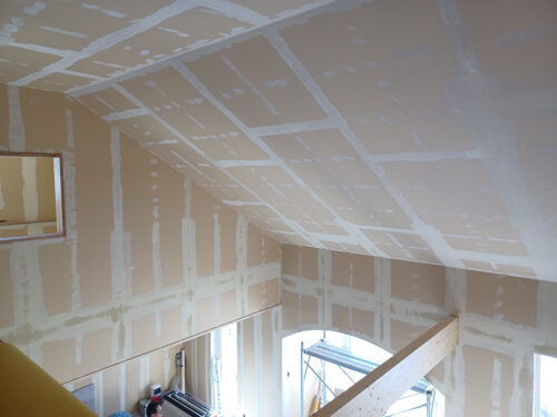 壁紙を貼る前にパテ処理を行い、石膏ボードの継ぎ目や