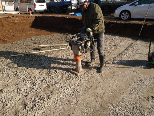 根掘りを行い、砕石砂利の敷き込み、転圧を行い地面を固めていきます。