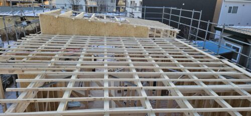 屋根の下地となるタルキを並べ、屋根合板を貼っていきます。