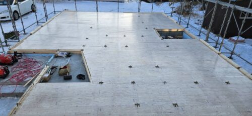 外周部に構造用合板が貼られ、サッシが取付けられました。