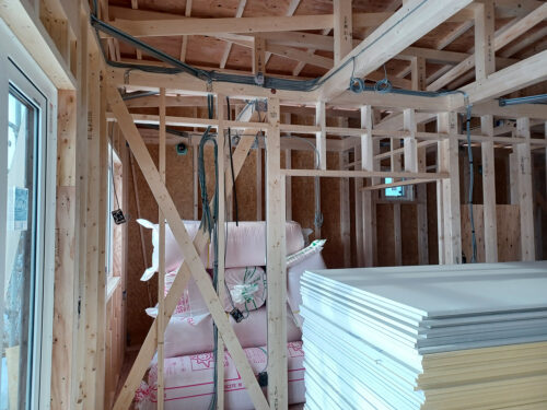 内部ではグラスウールの断熱材を入れた後に、気密シートを貼っていきます。
