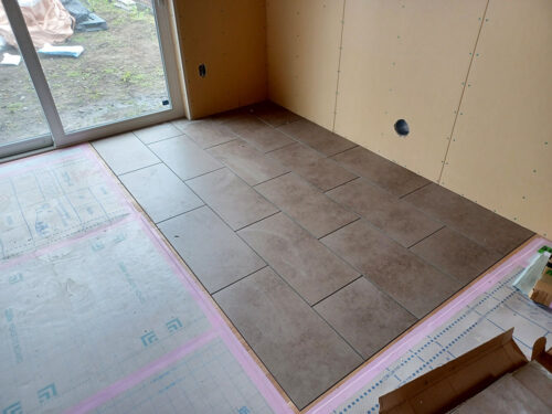 リビングの床の一部にタイルを貼っています。