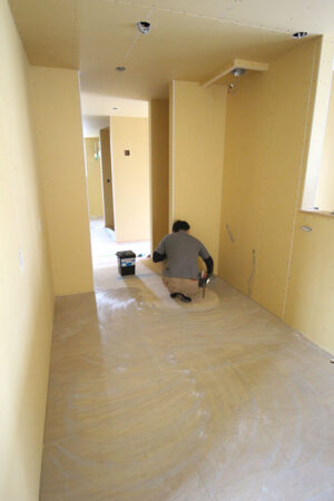 キッチンを設置する前に、フロアタイルを貼っていただきます。