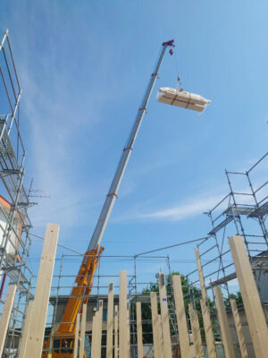 クレーンを使って梁をかけていきます。