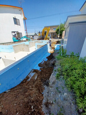 埋め戻しの際に、基礎の外周部に断熱材を敷き込みます。