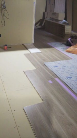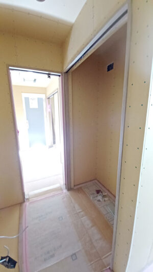 内部ではフローリング貼りや、建具の枠付けなど進んでおり