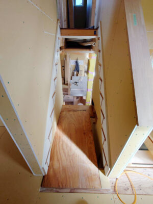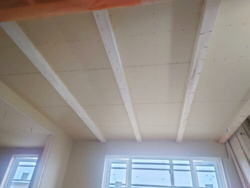 1階の壁・天井の石膏ボード貼りもほぼ貼り上がりました。