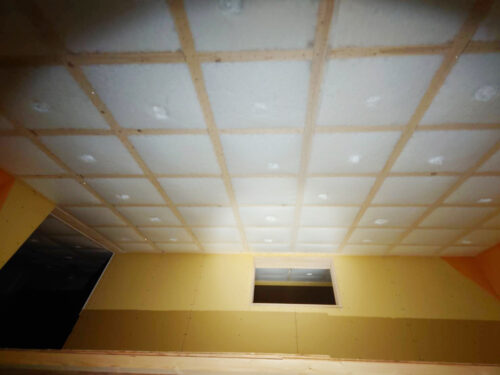 天井に、断熱材のブローイング吹込みが行われました。