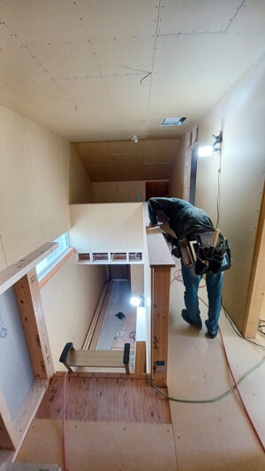腰壁の笠木を施工中の大工さん。笠木はタモ材を使っています。