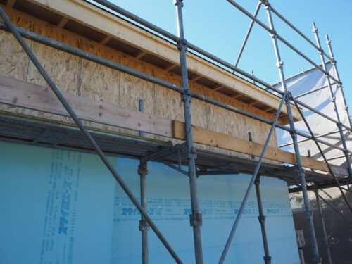 屋根下地工事が終わり、外部壁に構造用合板が張られました。