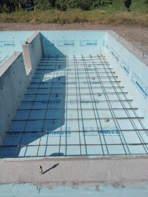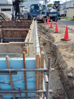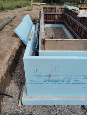 基礎断熱工法のため、外周部の布基礎の両面に断熱材を打ち込みます。