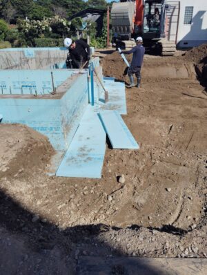 養生後、型枠を外して外部給排水の工事を行い埋め戻しをしていきます。