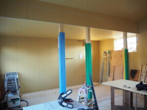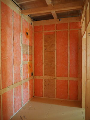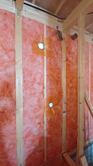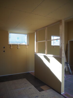 内部では壁内に下地入れを行い、気密シートを張り、石膏ボード張りを行っていきます。