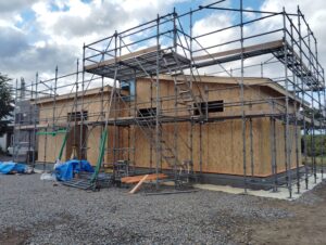 屋根下地工事が終わり、外部壁に構造用合板が張られました。