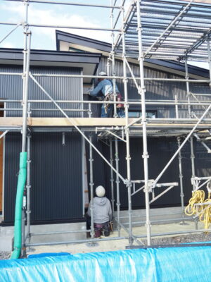 外部コーキングや電気・設備の外部仕上げが終わってから足場を解体していきます。