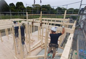 土台敷き、床合板張りが終わり建て込みが行われました。