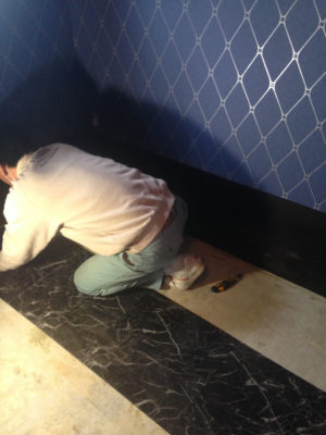 トイレの床材を張っています。