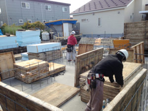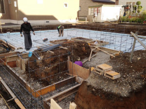 基礎の鉄筋を組む作業が始まります。基礎は、基礎断熱工法という工法を採用。