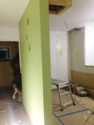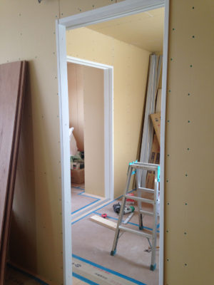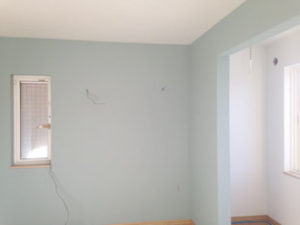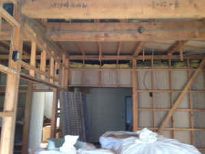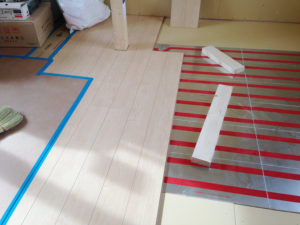 石膏ボード張りが終わり、床フローリング張りを行っています。
