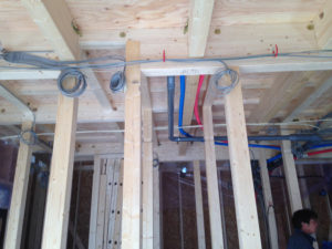 内部では、設備屋さんや電気屋さんによる配管・配線工事が進められています。