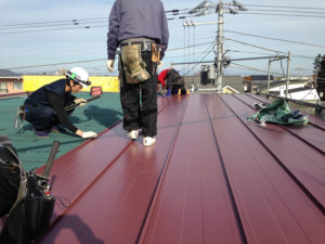 屋根板金工事が行われました。板金屋さんの職人さん総出で一斉に仕上げて行きます。