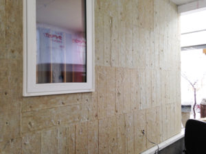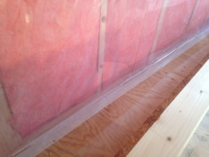 壁の防湿シートの施工。気密を取る為に、シートの端はしっかりとテープ処理します。