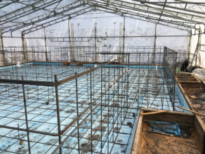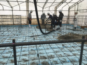基礎工事は土間の鉄筋組が終了し、いよいよ生コン打設です。