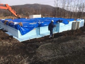 スカート断熱を敷き込んで埋め戻して行きます。